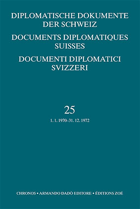 Le volume 25 (1970–1972) est marqué par l’accord de libre-échange avec la Communauté économique européenne. Les préparatifs pour la Conférence sur la sécurité et la coopération en Europe suivent par ailleurs leur cours. Le rôle du franc et de la place financière suisses se voit renforcé par la crise monétaire internationale. À côté de thèmes traditionnels tels que les relations avec les «États divisés», les «bons offices» et l’aide au développement, de nouveaux domaines d’activités entrent dans les compétences de la diplomatie suisse, à l’instar de la politique environnementale. L’interdépendance croissante entre politique intérieure et politique extérieure se fait sentir. Au travers d’attentats terroristes, la Suisse subit elle aussi les effets du conflit israélo-arabe.